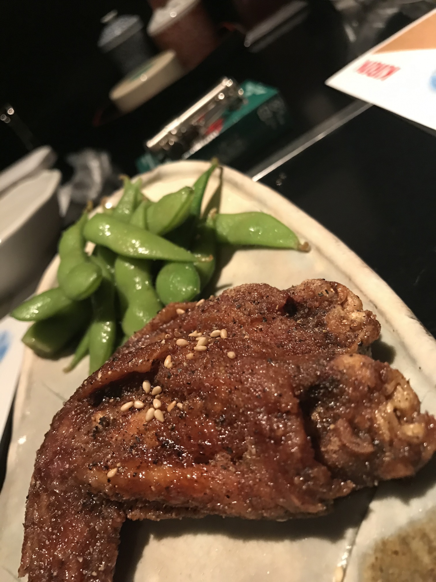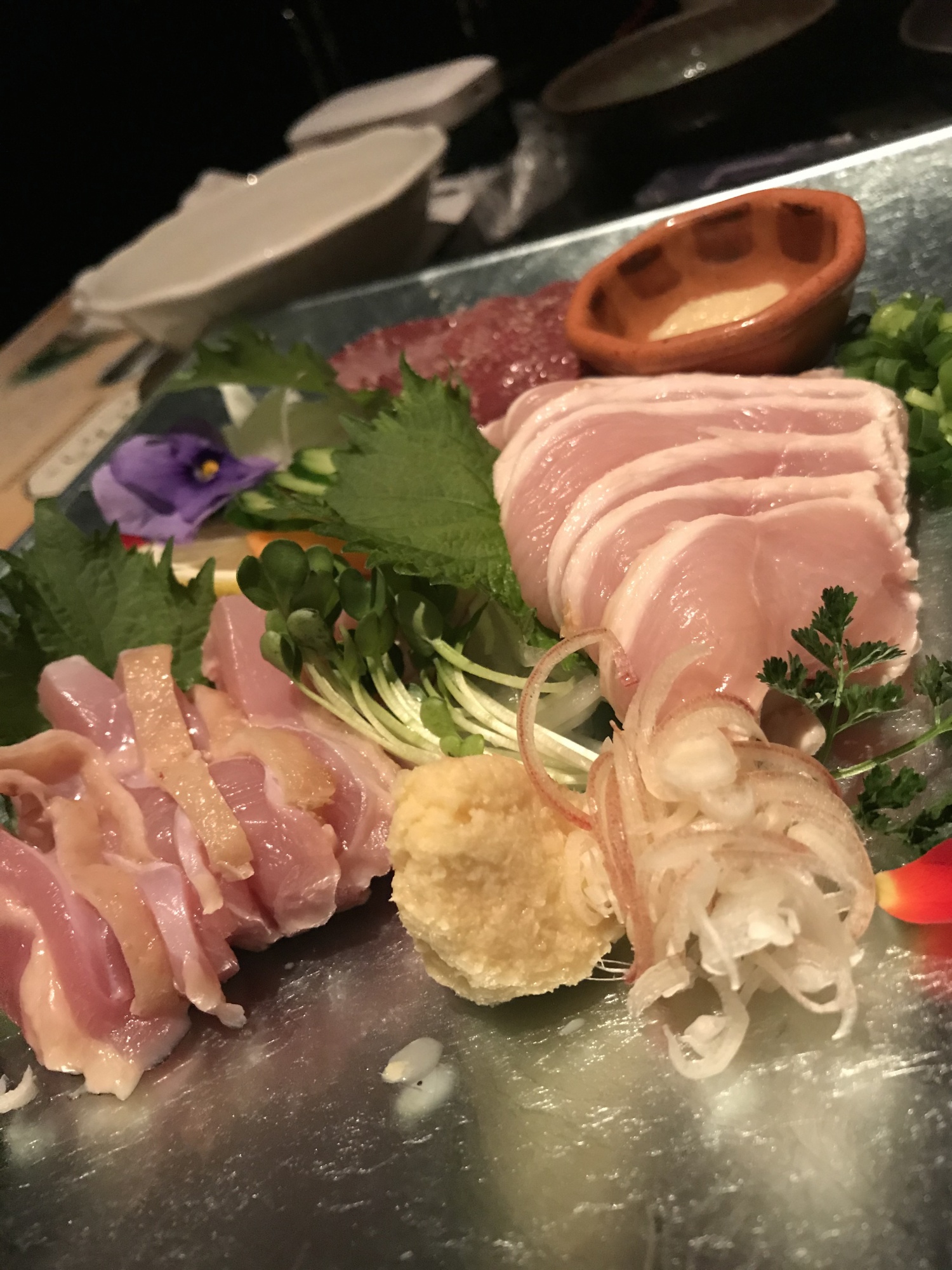 お薦めの「手羽唐揚げ」を2種類、とり刺身3種盛り、サラダ、コンニャクと鶏肉の鉄板焼きなど・・・・