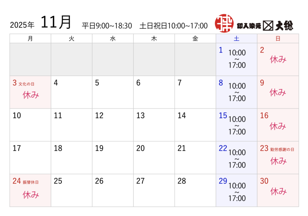 日頃より大変お世話になり、誠にありがとうございます。 11月の営業日程となります。 ご確認のほどよろしくお願い申しあげます。