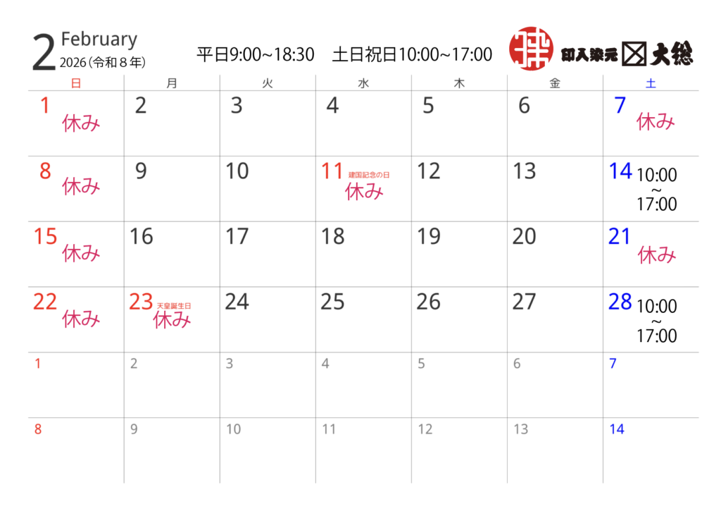 お世話になります。 2月の営業日程となります。 2月は28日まで。。。短い月ですね!